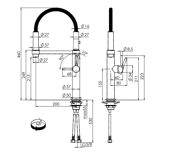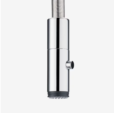 - Смеситель однорычажный с гибким шлангом под металлической пружиной и переключением струя-душ